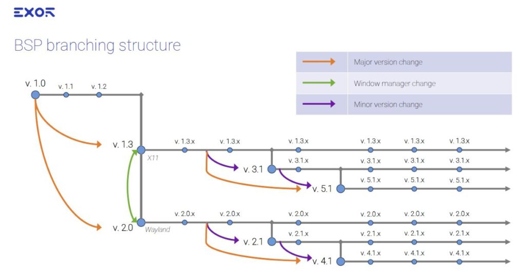 In onderstaande afbeelding is de huidige BSP branching structure te zien. Vanaf versie 1.2 splitst de versielijn zich op in twee parallelle takken. De oneven lijn loopt van 1.3 via 3.1 naar 5.1 en is bedoeld voor panelen waarop JMobile draait en eventueel ook CODESYS wordt toegepast. De even lijn loopt van 2.0 via 2.1 naar 4.1 en is geoptimaliseerd voor panelen die Chromium gebruiken, bijvoorbeeld voor het weergeven van webpagina’s of webvisualisaties.