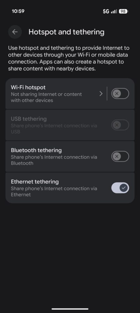 - Zet “Ethernet tethering” aan